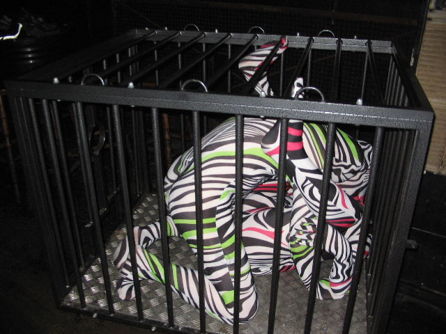 Mortice and LycraWolf in stripy Lycra suits in a cage