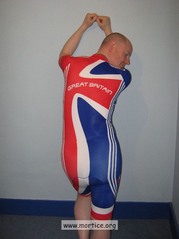 Mortice in Lycra GB cycle suit and padlocked neckchain